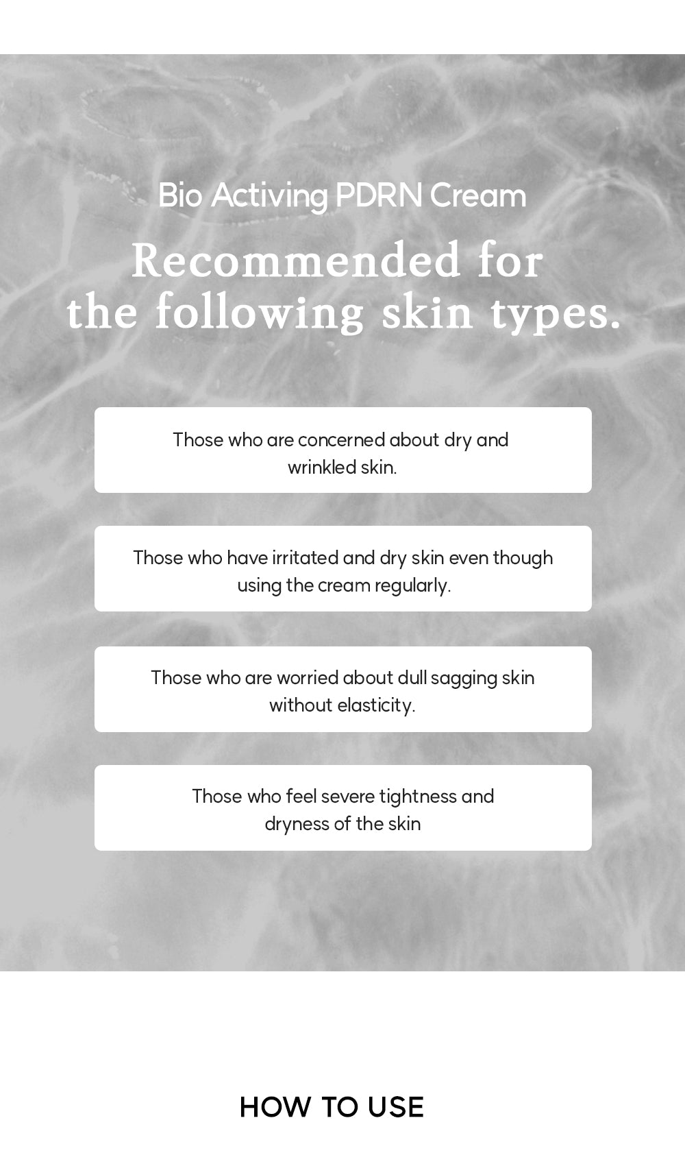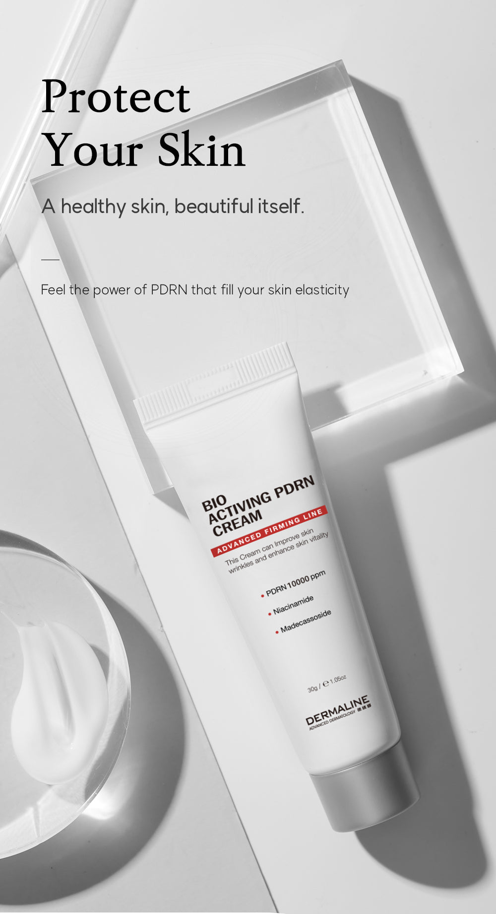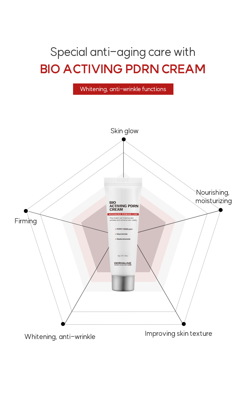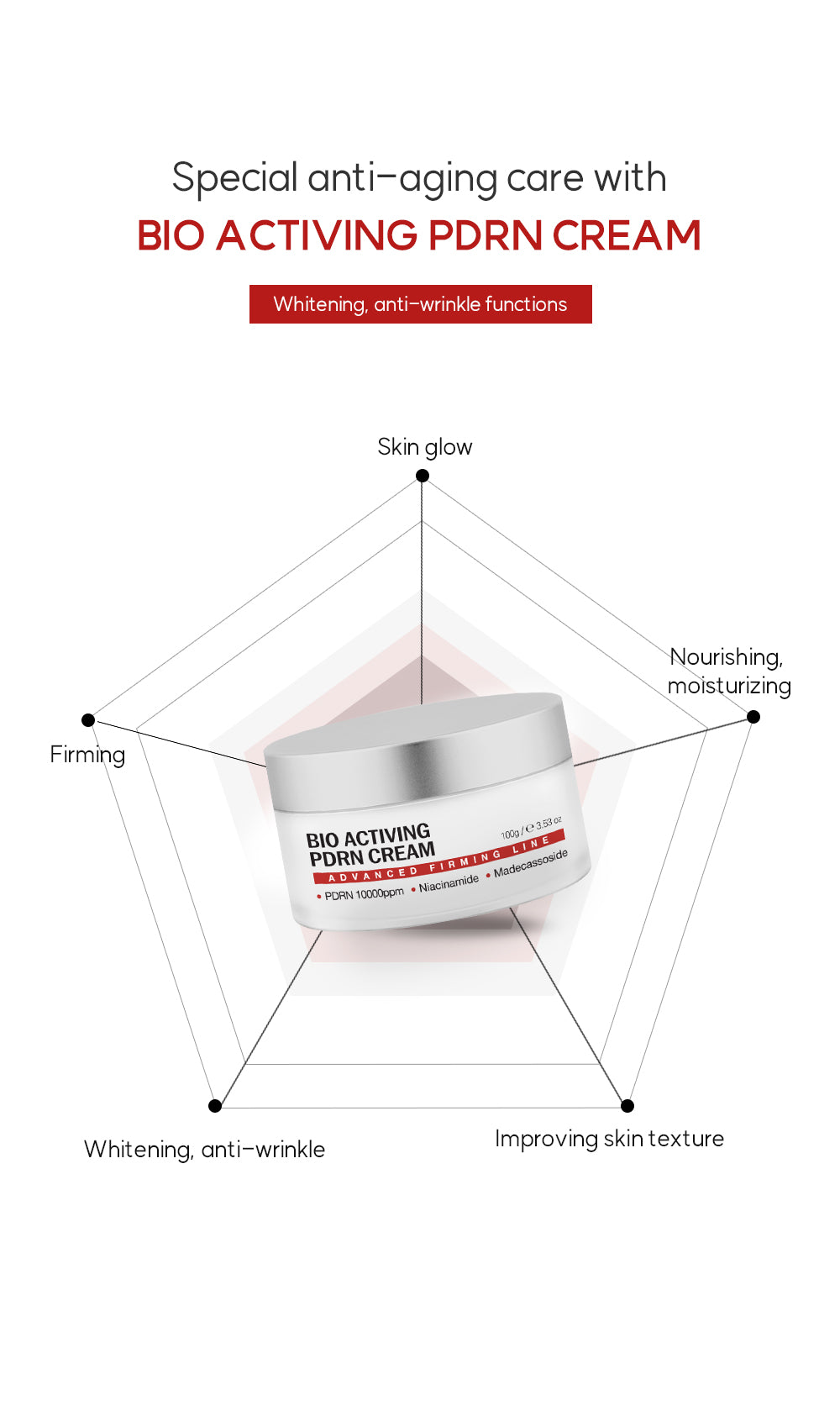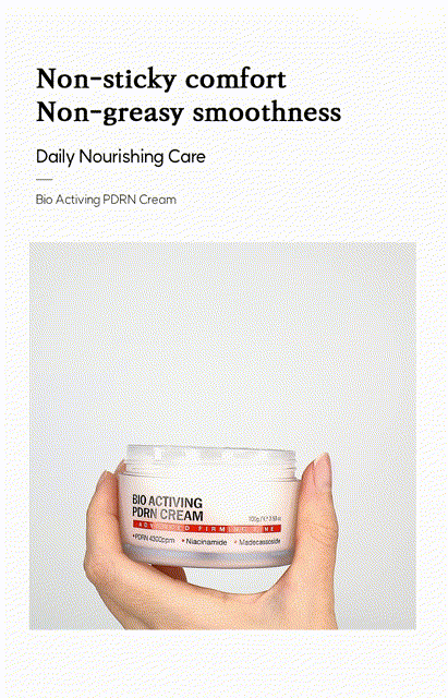 Bio-Activing PDRN Cream is a formula designed to improve the appearance of aging skin. With 10000 ppm PDRN, Hyaluronic Acid, Hydrolyzed Collagen, and Madecassoside, it helps deeply hydrate and brighten the complexion, while Niacinamide works to improve wrinkles and skin elasticity.