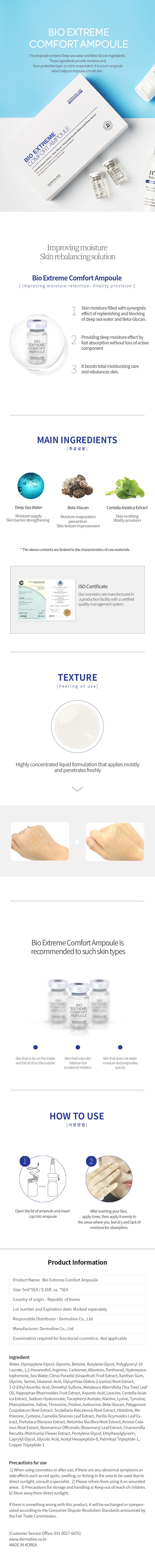 Bio Extreme Comfort Ampoule is a professional-grade skincare product featuring deep sea water, beta-glucan ingredients, and ultra-rich moisture. Deep sea water provides up to 45% more hydration than regular water, and beta-glucan locks that moisture in while restoring skin’s natural protective barrier. Experience true skin comfort with this ampoule.