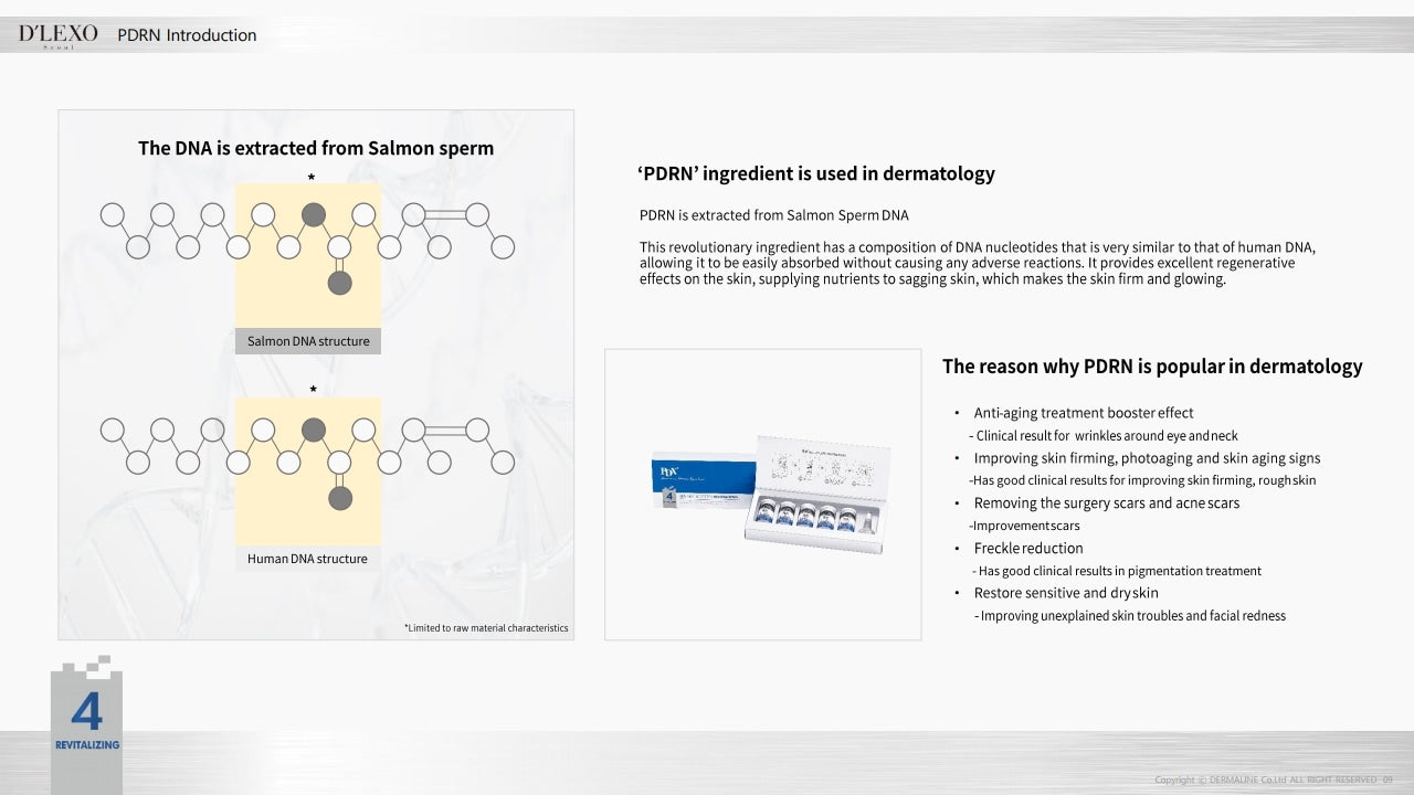 Revitalize and moisturize your skin with the D'LEXO PDX⁴ Skin Booster. Infused with pdrn for added nourishment, this formula also contains cica exosome for a refreshed and rejuvenated complexion. Experience the benefits of this revitalizing skin booster today.