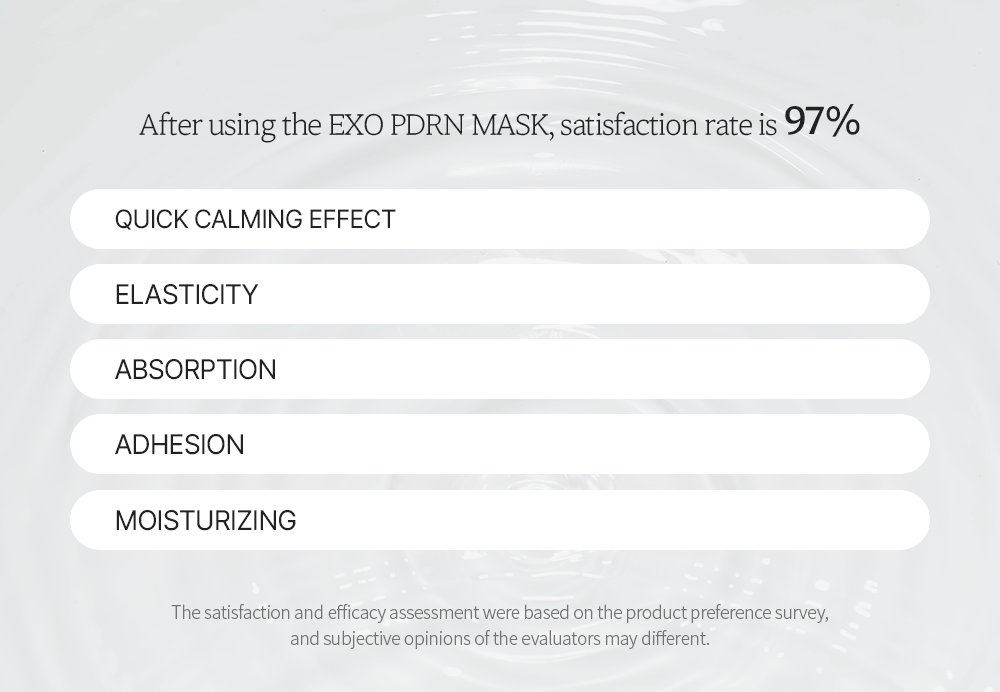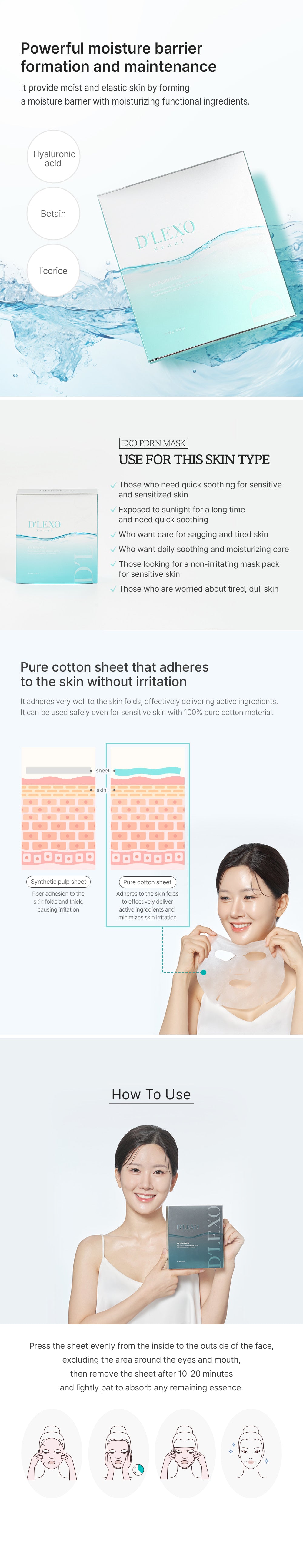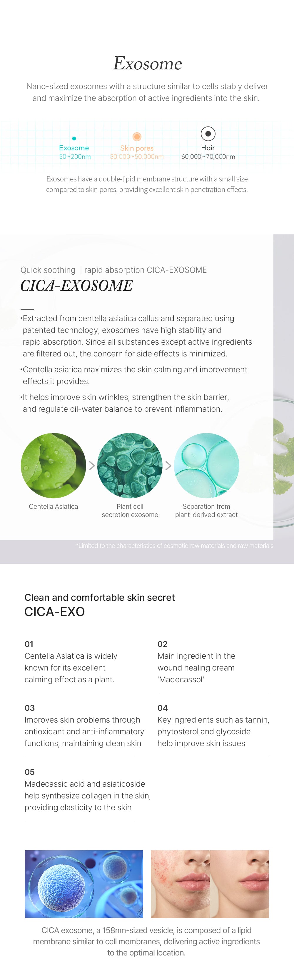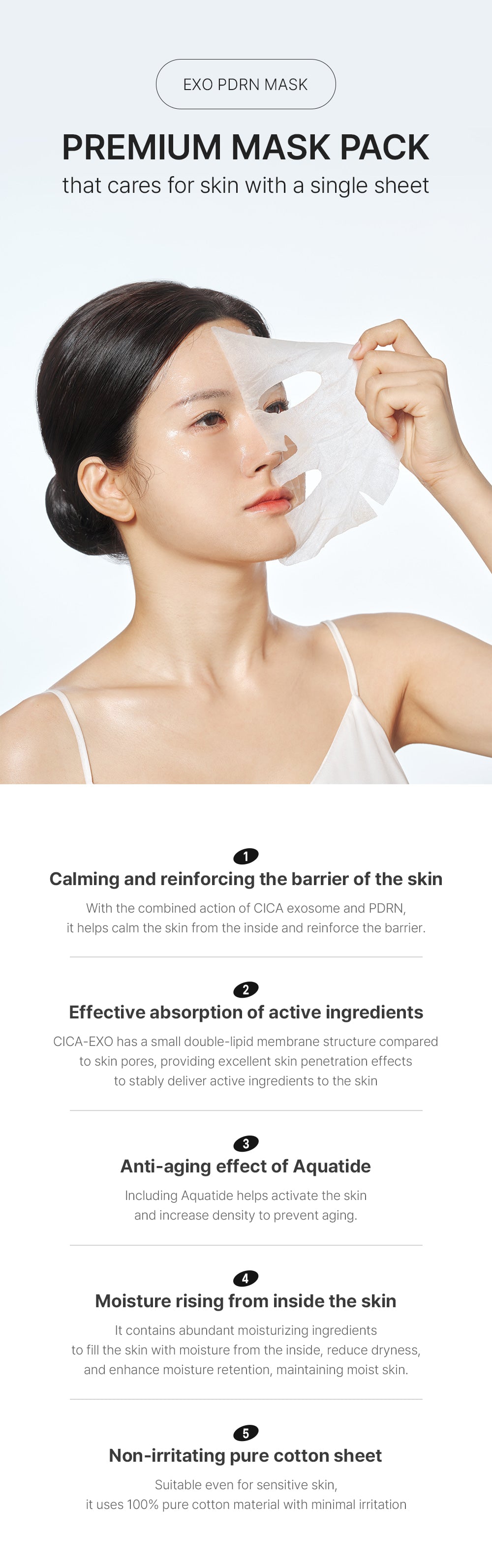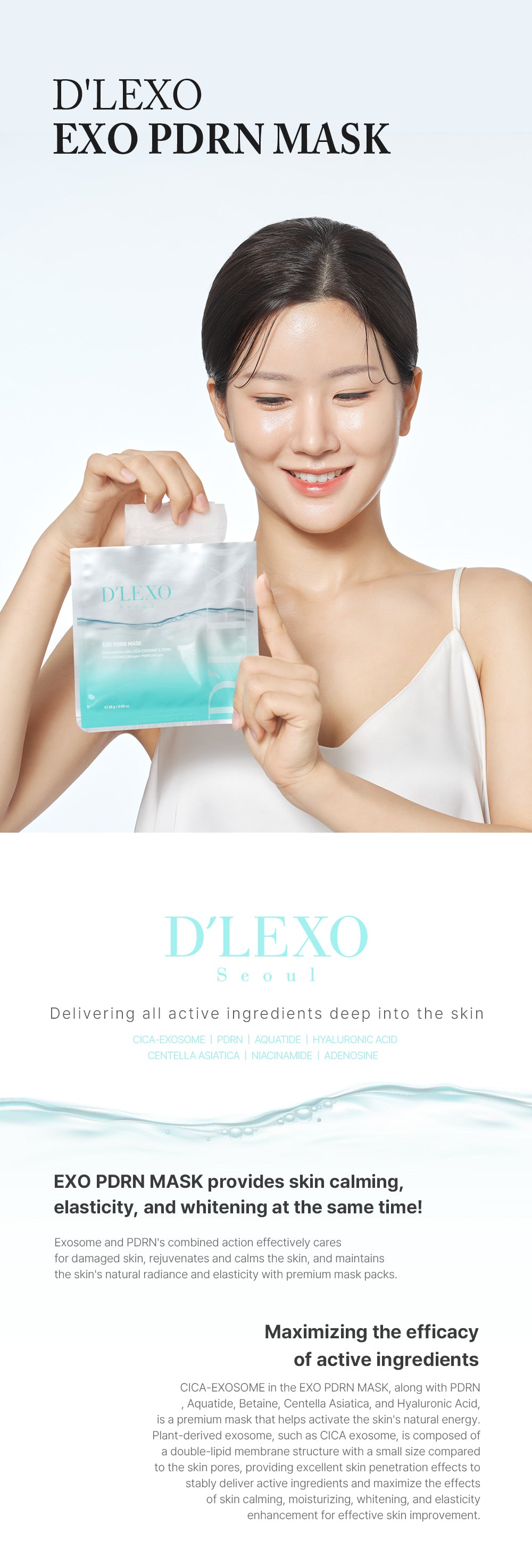CICA-EXOSOME in the EXO PDRN MASK, along with PDRN, Aquatide, Betaine, Centella Asiatica, and Hyaluronic Acid is a premium mask that helps activate the skin's natural energy plant-derived exosome, such as CICA exosome, is composed of a double-lipid membrane structure with a small size compared to the skin pores, providing excellent skin penetration effects to stably deliver active ingredients and maximize the effects