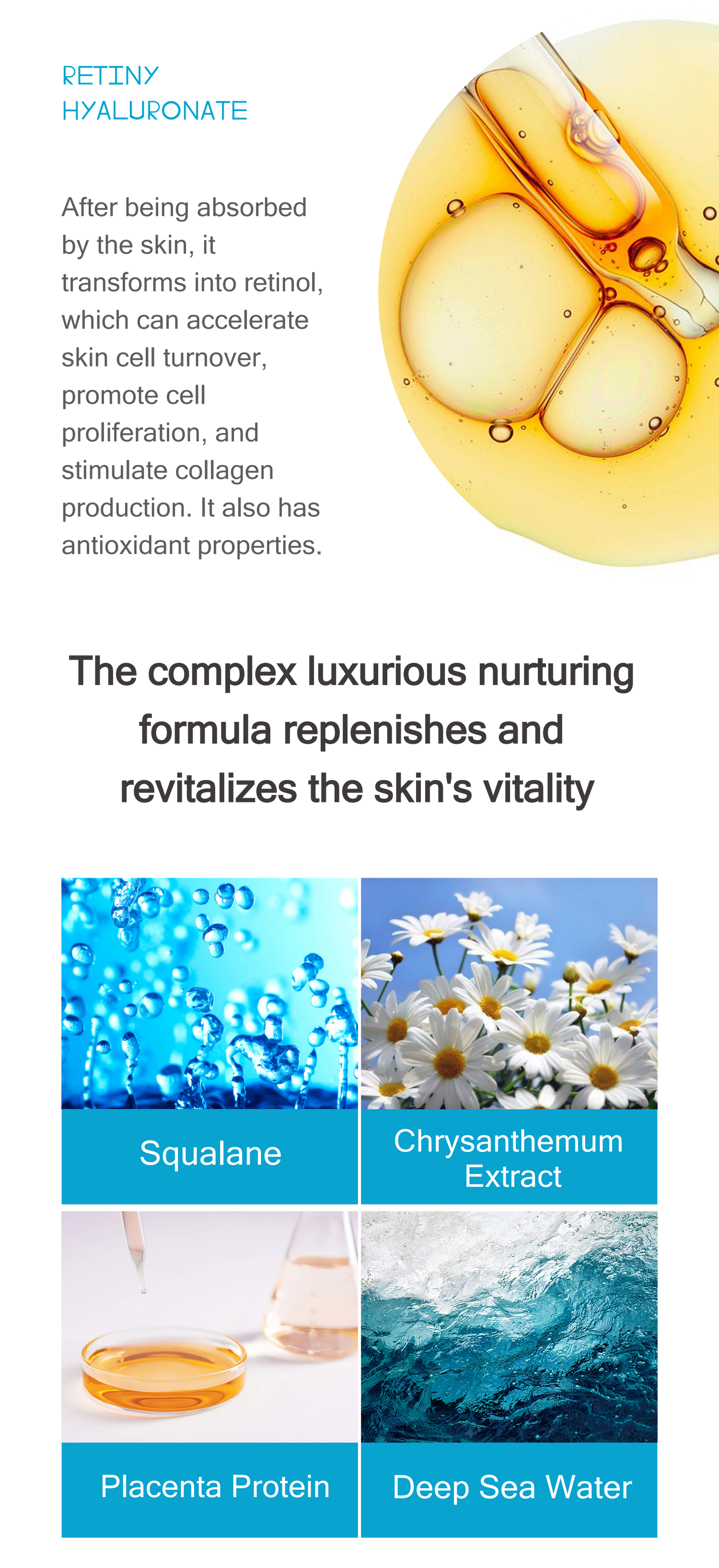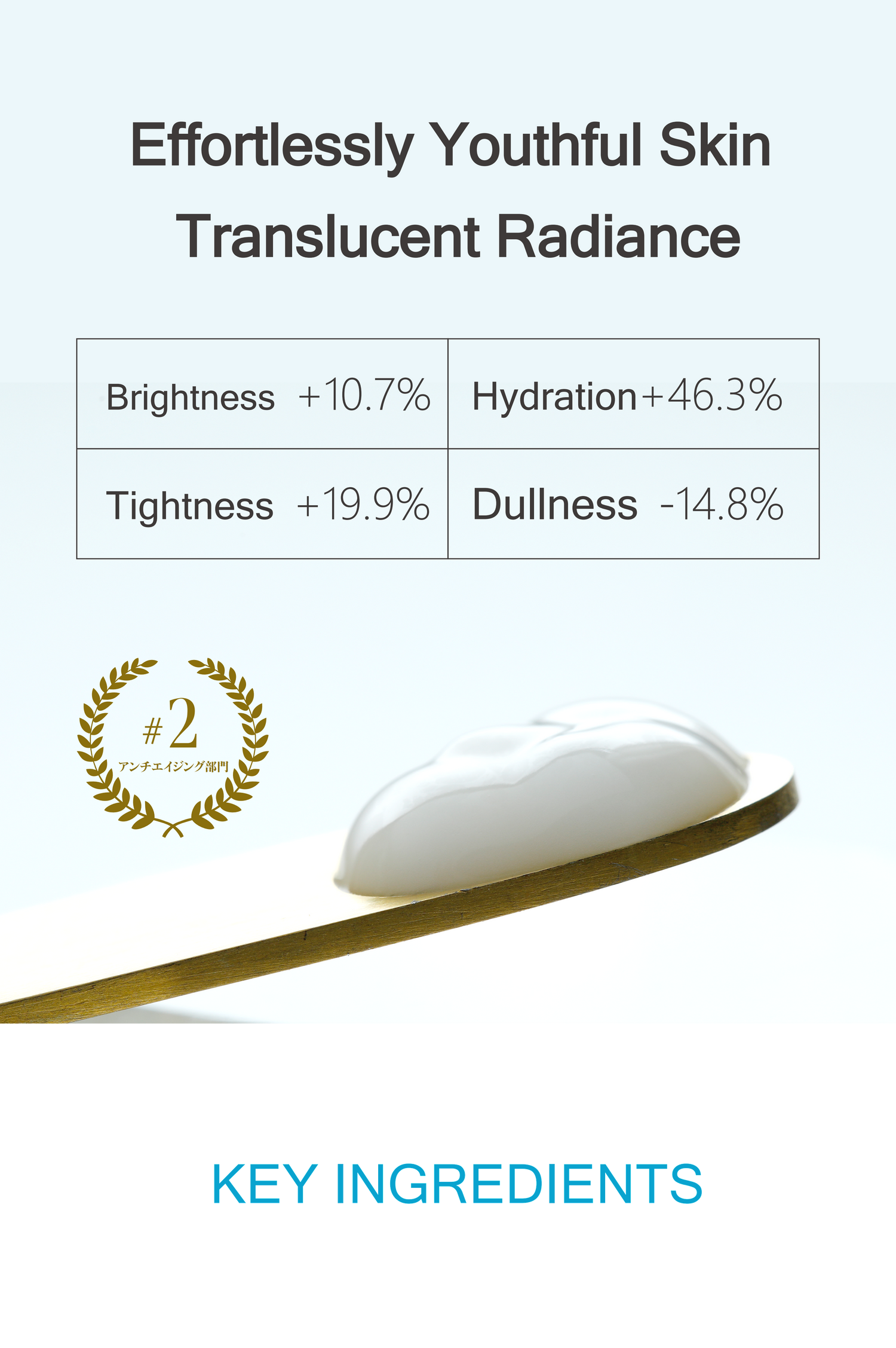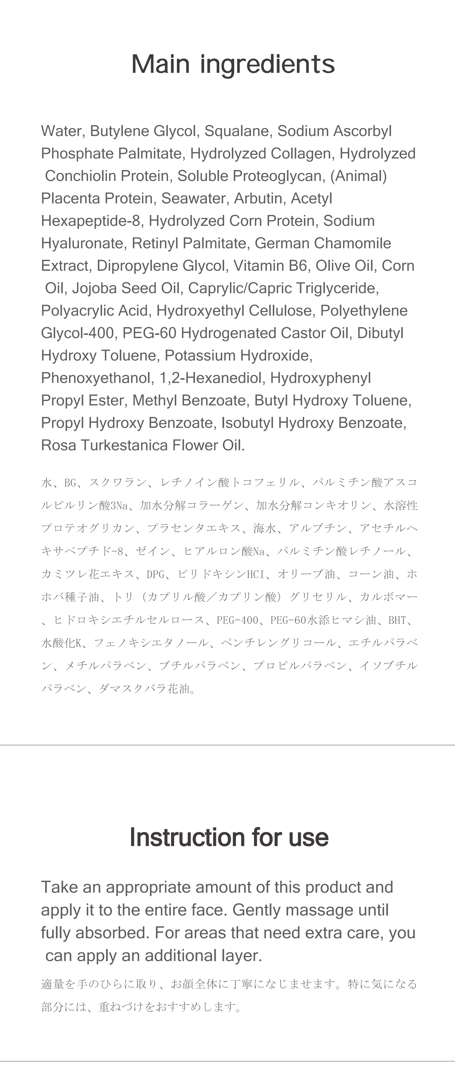 Water, Butylene Glycol, Squalane, Sodium Ascorbyl Phosphate Palmitate, Hydrolyzed Collagen, Hydrolyzed Conchiolin Protein, Soluble Proteoglycan, (Animal) Placenta Protein, Seawater, Arbutin, Acetyl Hexapeptide-8, Hydrolyzed Corn Protein, Sodium Hyaluronate, Retinyl Palmitate, German Chamomile Extract, Dipropylene Glycol, Vitamin B6, Olive Oil, Corn Oil, Jojoba Seed Oil, Caprylic/Capric Triglyceride, Polyacrylic Acid, Hydroxyethyl Cellulose, Polyethylene Glycol-400, PEG-60 Hydrogenated Castor Oil, Dibutyl Hydroxy Toluene, Potassium Hydroxide, Phenoxyethanol, 1,2-Hexanediol, Hydroxyphenyl Propyl Ester, Methyl Benzoate, Butyl Hydroxy Toluene, Propyl Hydroxy Benzoate, Isobutyl Hydroxy Benzoate, Rosa Turkestanica Flower Oil.