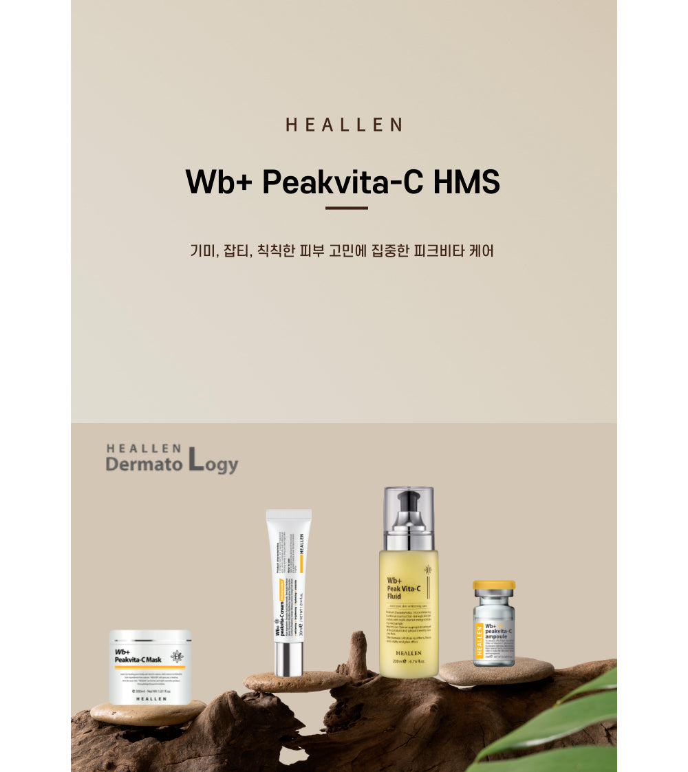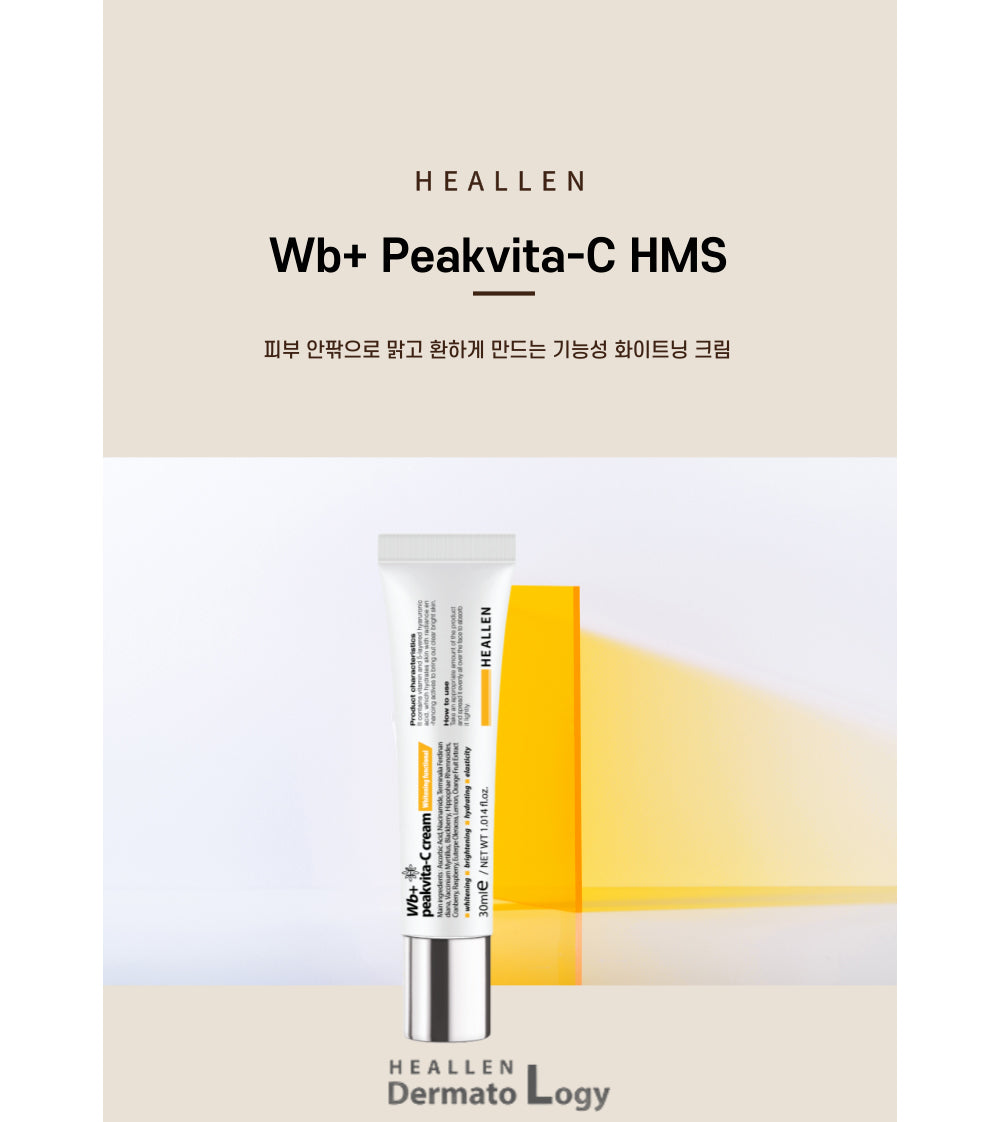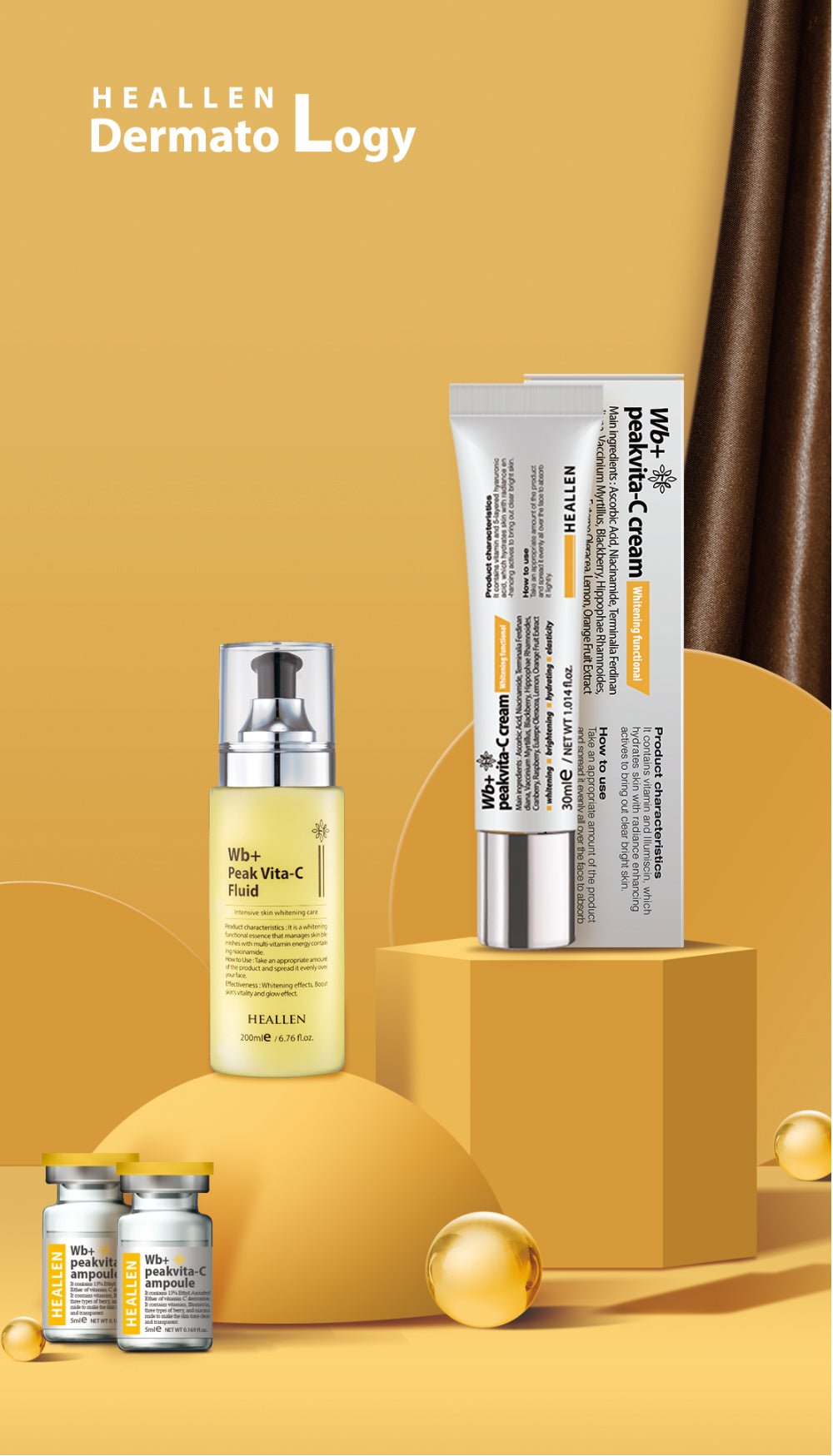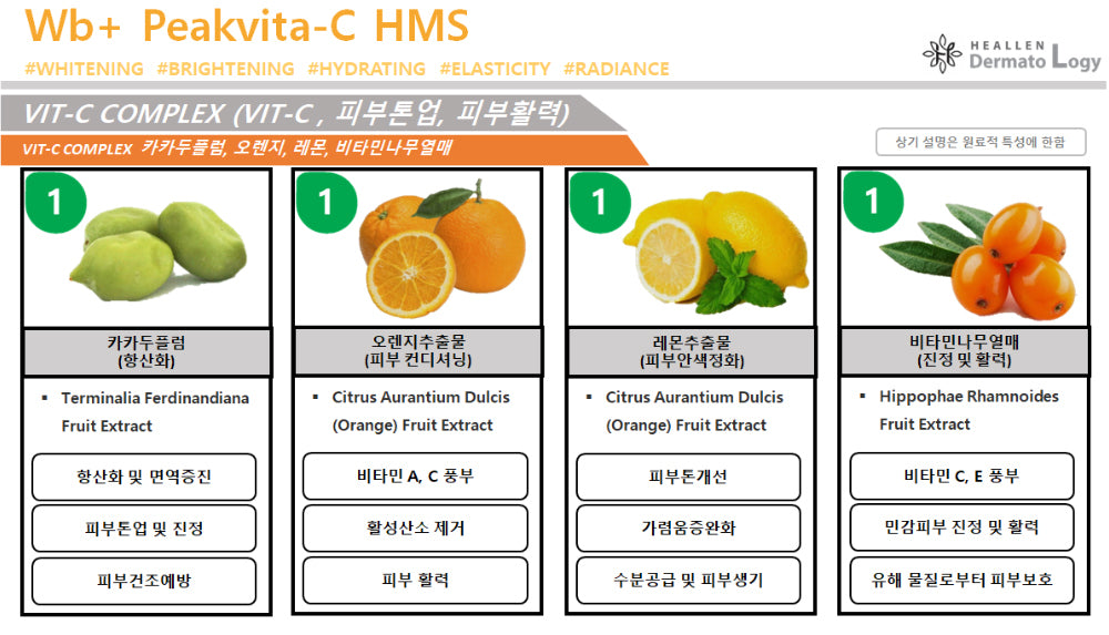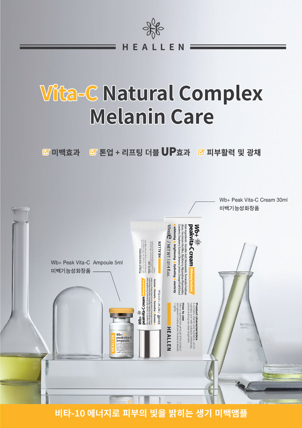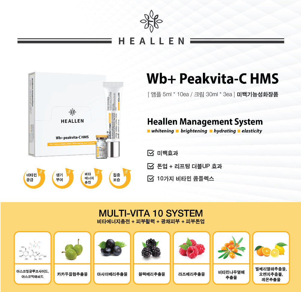 HEALLEN Wb+ Peak Vita-C kit features a VITA-C NATURAL COMPLEX SYSTEM with rich-vitamin active ingredients that promote clear and transparent skin. This brightening functional kit provides tangible results for a brighter complexion.