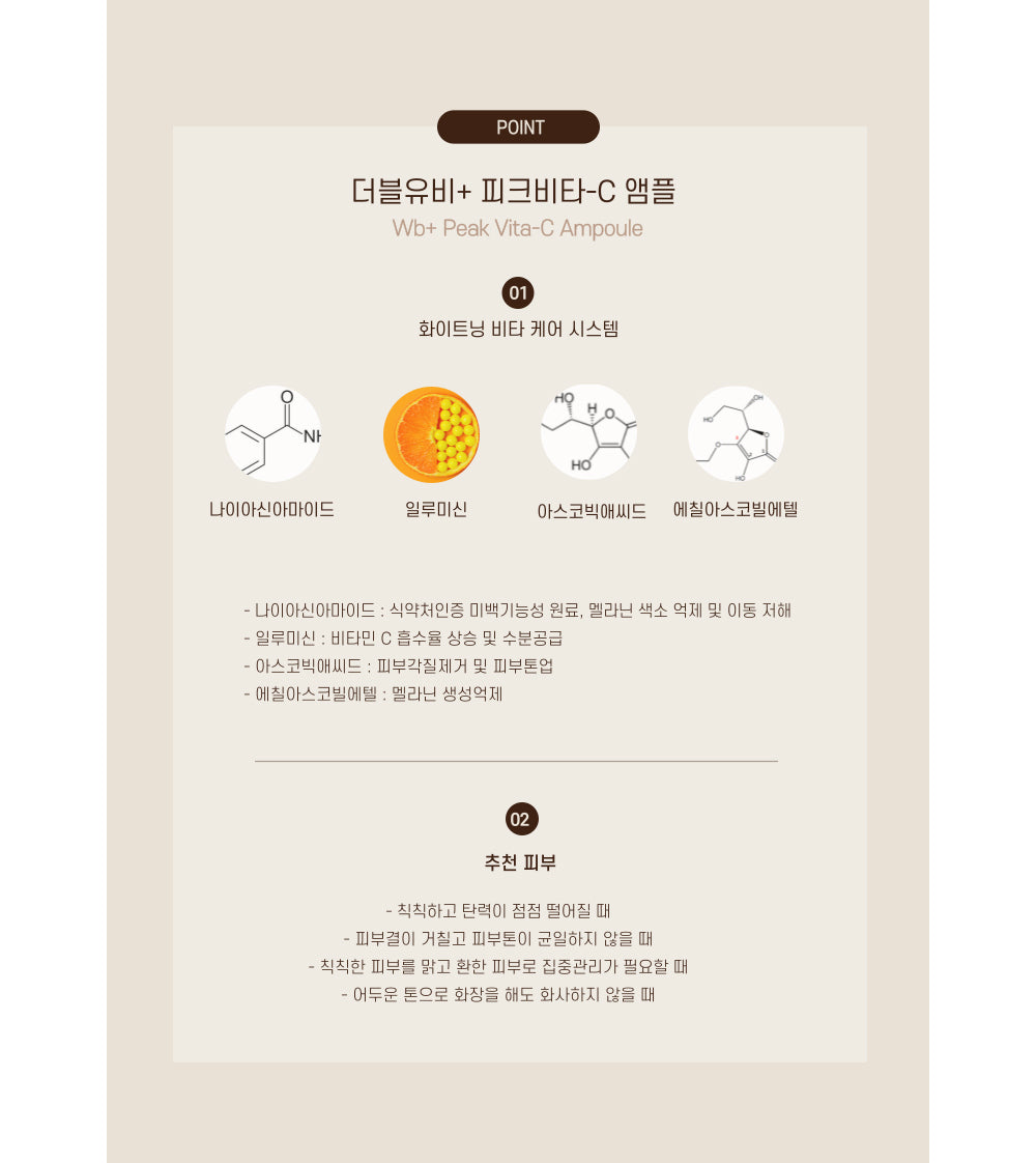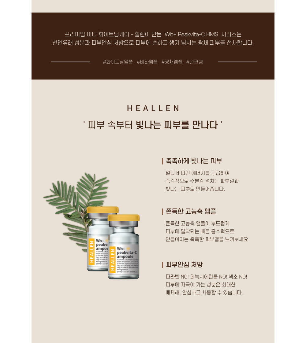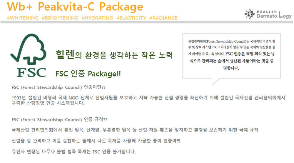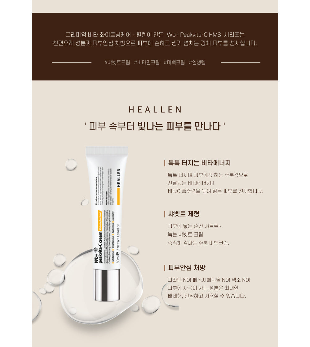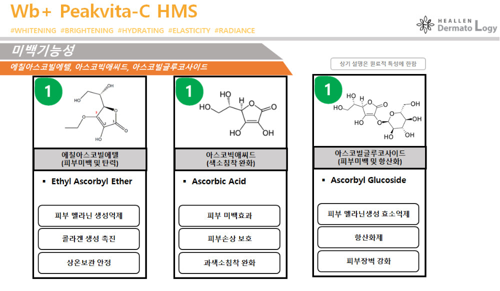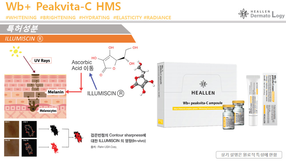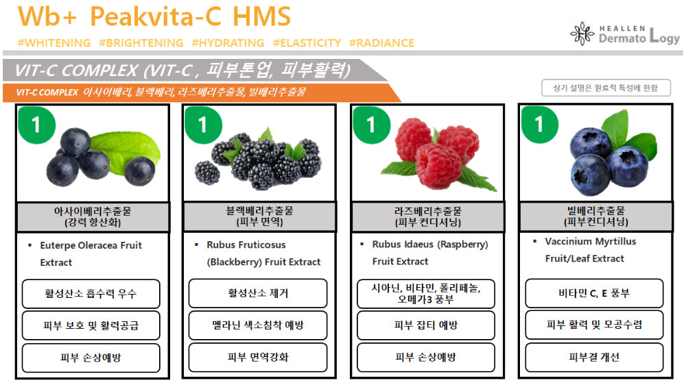 HEALLEN Wb+ Peak Vita-C kit features a VITA-C NATURAL COMPLEX SYSTEM with rich-vitamin active ingredients that promote clear and transparent skin. This brightening functional kit provides tangible results for a brighter complexion.