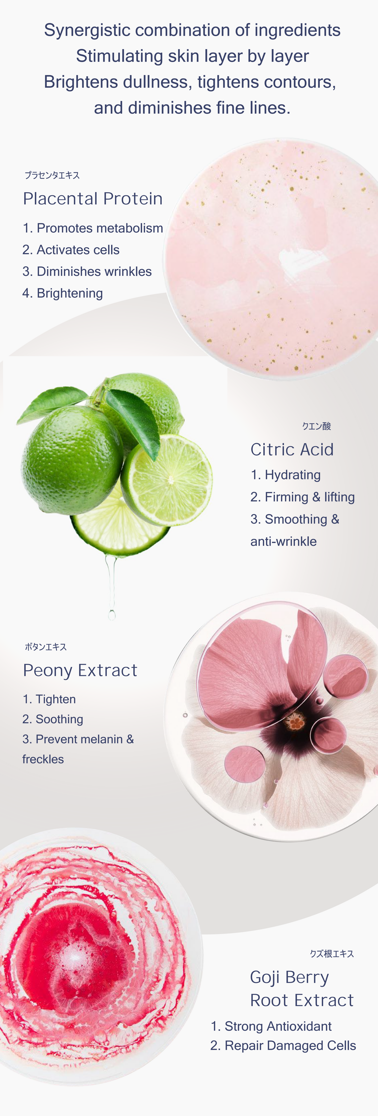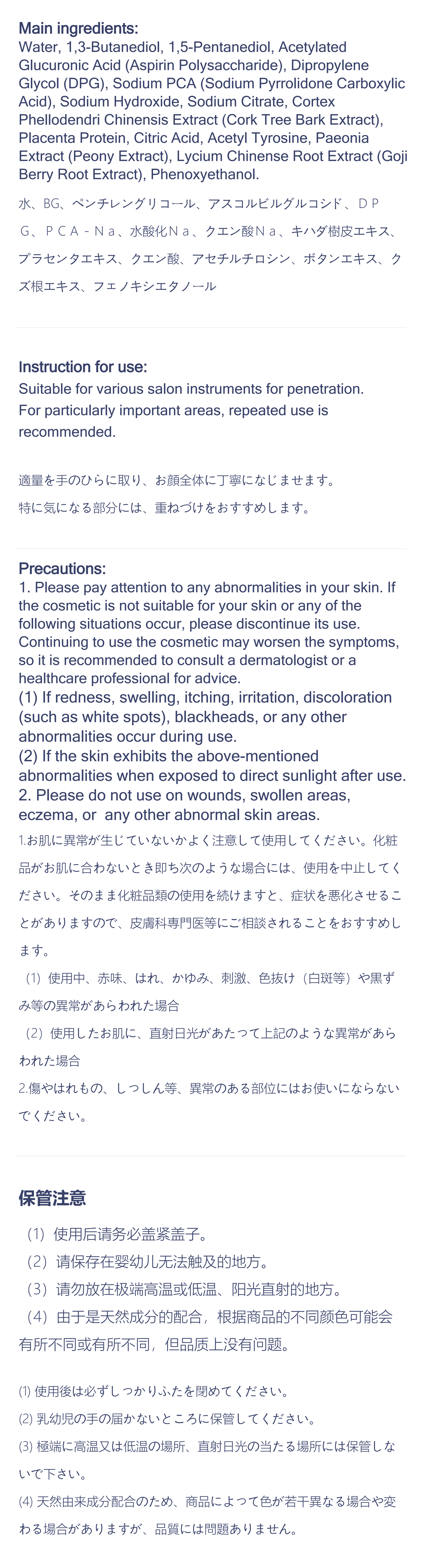 Water, 1,3-Butanediol, 1,5-Pentanediol, Acetylated Glucuronic Acid (Aspirin Polysaccharide), Dipropylene Glycol (DPG), Sodium PCA (Sodium Pyrrolidone Carboxylic Acid), Sodium Hydroxide, Sodium Citrate, Cortex Phellodendri Chinensis Extract (Cork Tree Bark Extract), Placenta Protein, Citric Acid, Acetyl Tyrosine, Paeonia Extract (Peony Extract), Lycium Chinense Root Extract (Goji Berry Root Extract), Phenoxyethanol.