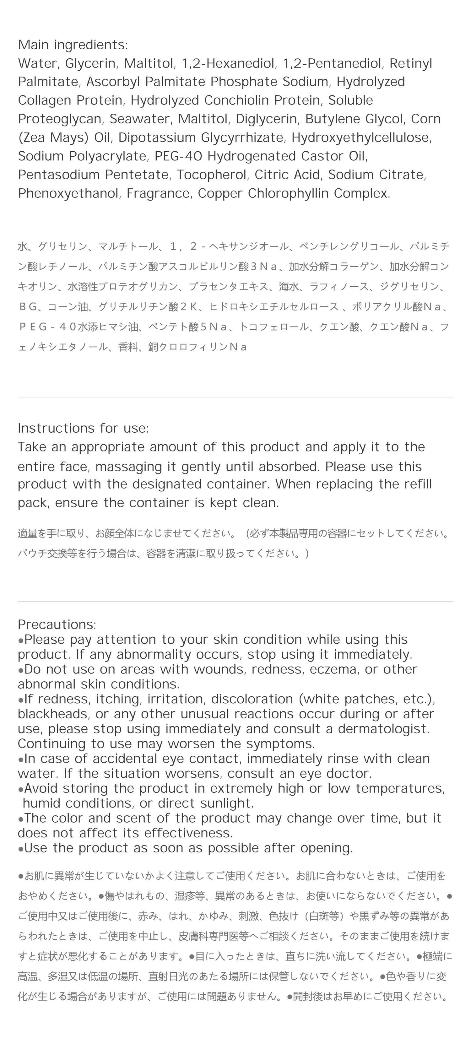 Take an appropriate amount of this product and apply it to the entire face, massaging it gently until absorbed. Please use this product with the designated container. When replacing the refill pack, ensure the container is kept clean.
