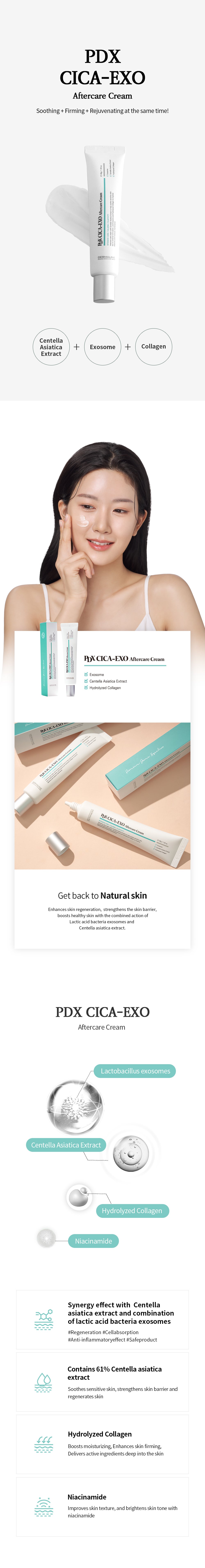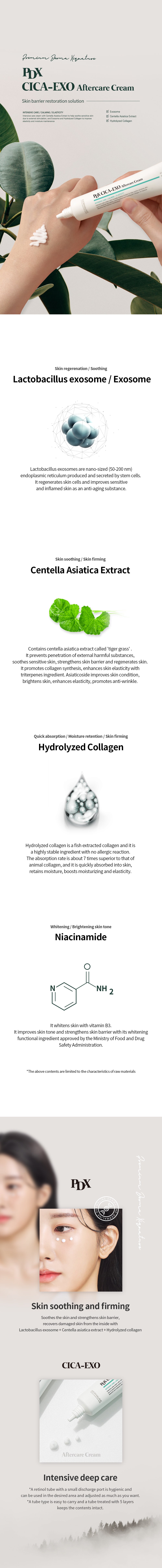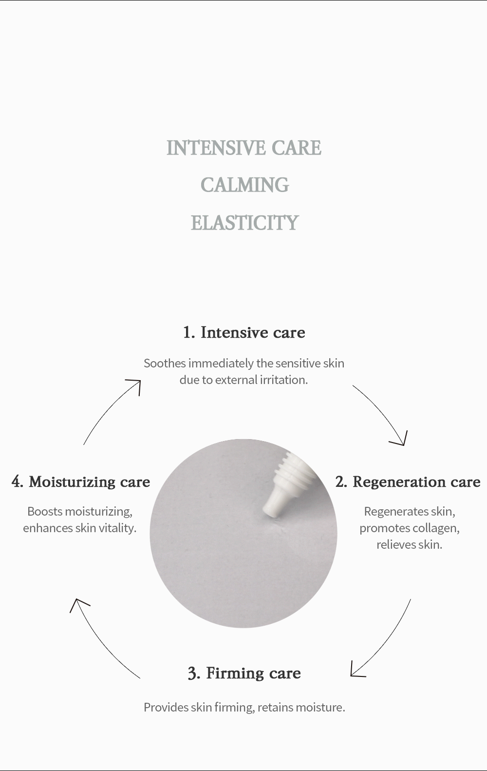 Intensive care cream with Centella Asiatica Extract to help soothe sensitive skin due to external stimulation, and Exosome and Hydrolyzed Collagen to improve elasticity and moisture maintenance.