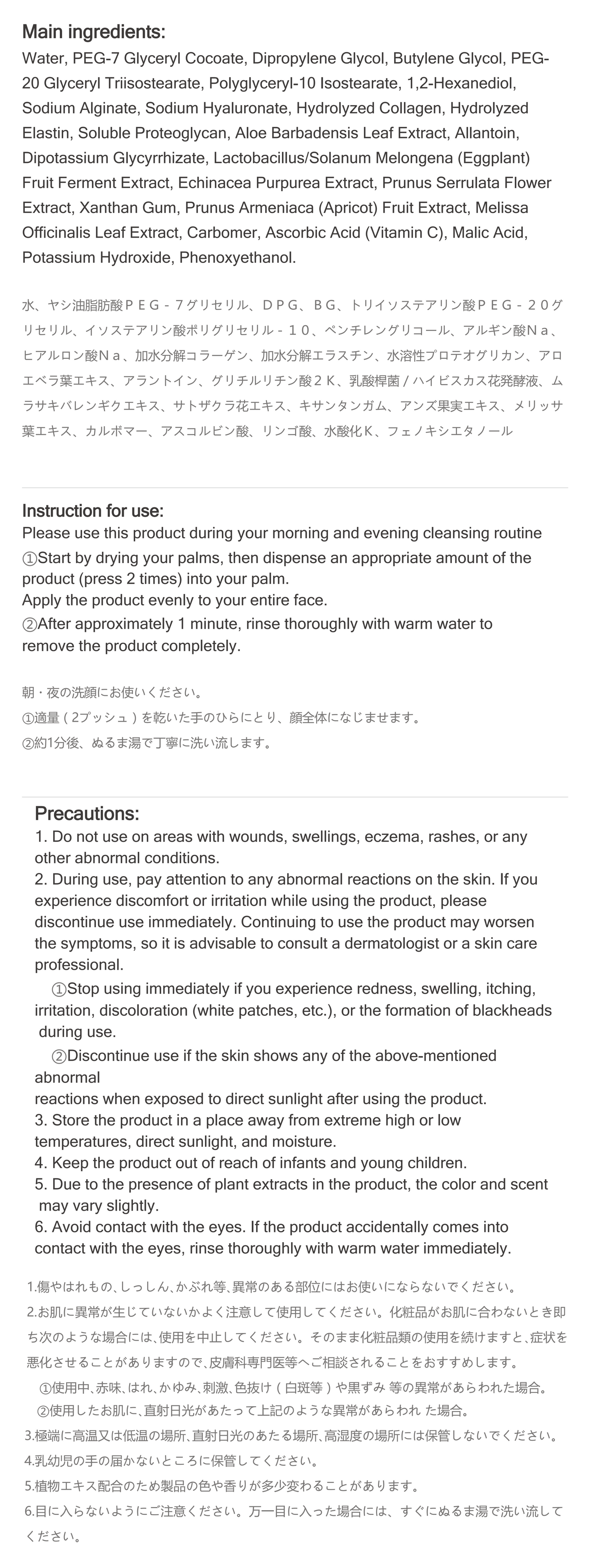 Water, PEG-7 Glyceryl Cocoate, Dipropylene Glycol, Butylene Glycol, PEG-20 Glyceryl Triisostearate, Polyglyceryl-10 Isostearate, 1,2-Hexanediol, Sodium Alginate, Sodium Hyaluronate, Hydrolyzed Collagen, Hydrolyzed Elastin, Soluble Proteoglycan, Aloe Barbadensis Leaf Extract, Allantoin, Dipotassium Glycyrrhizate, Lactobacillus/Solanum Melongena (Eggplant) Fruit Ferment Extract, Echinacea Purpurea Extract, Prunus Serrulata Flower Extract, Xanthan Gum, Prunus Armeniaca (Apricot) Fruit Extract, Melissa Officinalis Leaf Extract, Carbomer, Ascorbic Acid (Vitamin C), Malic Acid, Potassium Hydroxide, Phenoxyethanol.