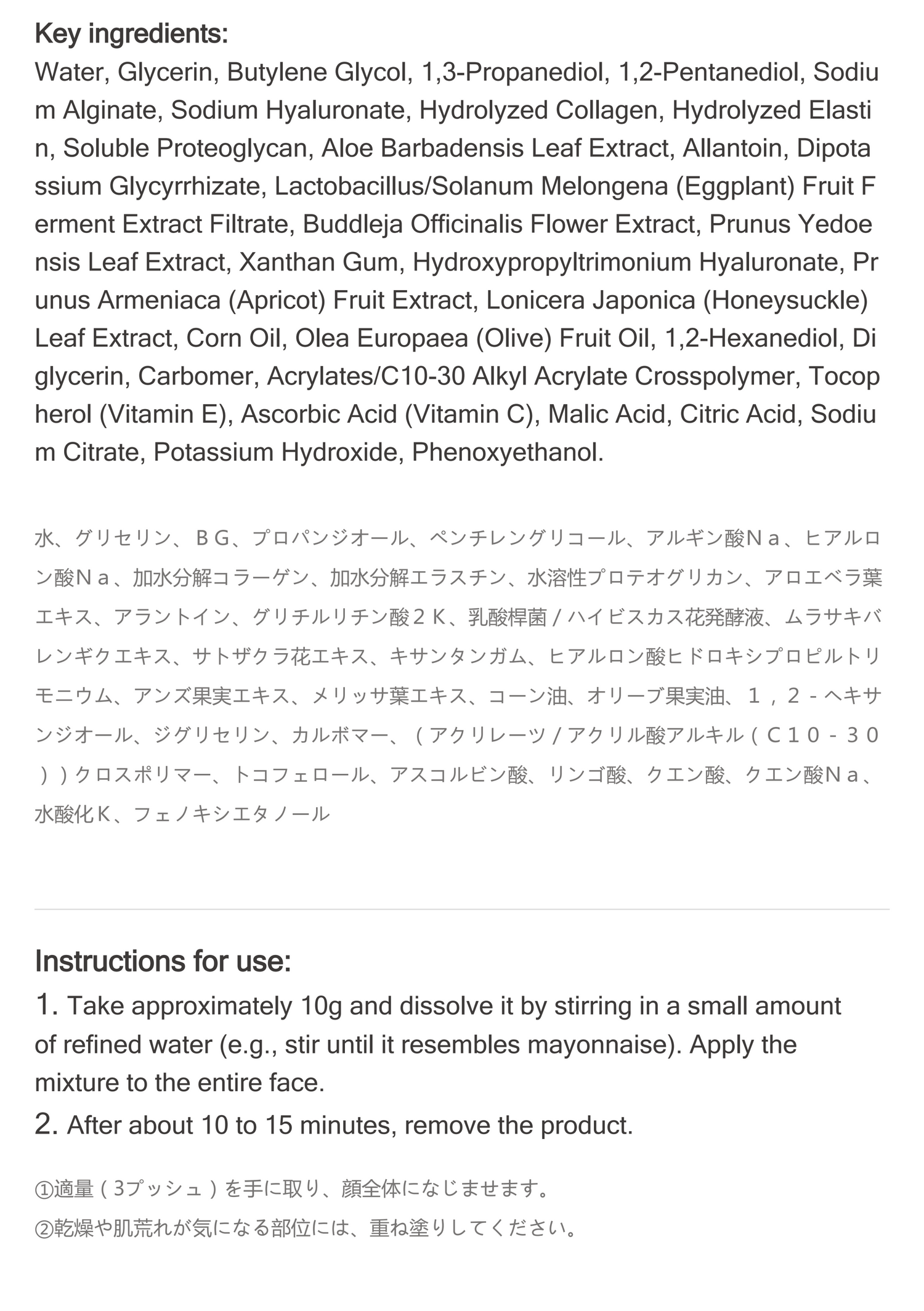Water, Glycerin, Butylene Glycol, 1,3-Propanediol, 1,2-Pentanediol, Sodium Alginate, Sodium Hyaluronate, Hydrolyzed Collagen, Hydrolyzed Elastin, Soluble Proteoglycan, Aloe Barbadensis Leaf Extract, Allantoin, Dipotassium Glycyrrhizate, Lactobacillus/Solanum Melongena (Eggplant) Fruit Ferment Extract Filtrate, Buddleja Officinalis Flower Extract, Prunus Yedoensis Leaf Extract, Xanthan Gum, Hydroxypropyltrimonium Hyaluronate, Prunus Armeniaca (Apricot) Fruit Extract, Lonicera Japonica (Honeysuckle) Leaf Extract, Corn Oil, Olea Europaea (Olive) Fruit Oil, 1,2-Hexanediol, Diglycerin, Carbomer, Acrylates/C10-30 Alkyl Acrylate Crosspolymer, Tocopherol (Vitamin E), Ascorbic Acid (Vitamin C), Malic Acid, Citric Acid, Sodium Citrate, Potassium Hydroxide, Phenoxyethanol.